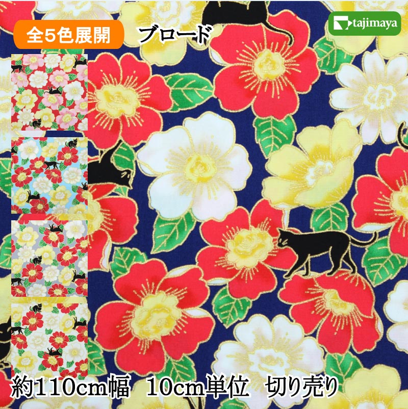 和柄 金彩つばきに黒ネコ文様 全5色【布地 生地 和柄】【和柄生地】
