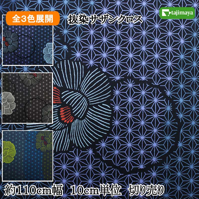和柄 抜染pt 麻の葉地華紋文様 全3色 110cm幅 10cm単位 切り売り【和 生地 布地 和柄生地】