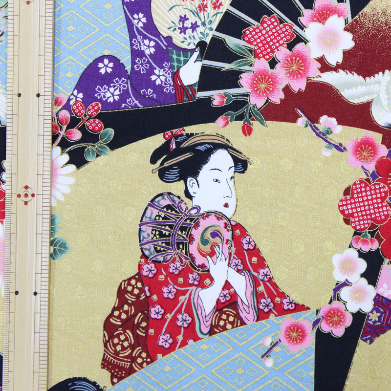 和調木綿(金彩扇面に浮世絵文様)黒 【布地 生地 和柄】【和柄生地】