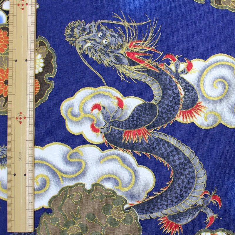和調木綿(金彩荒波に龍と雪輪文様)紺 【布地 生地 和柄】【和柄生地】B