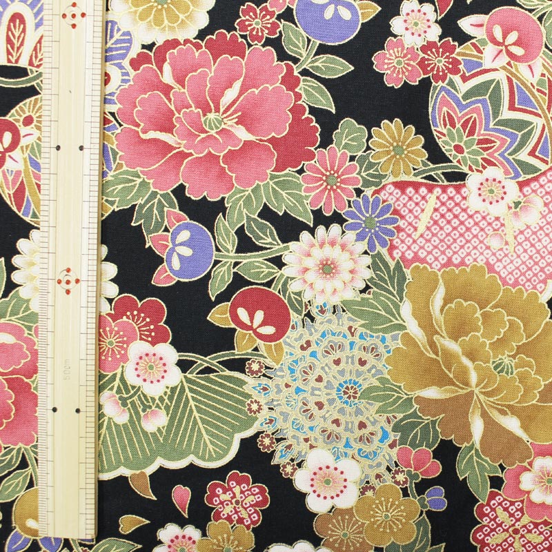 和柄(金彩毬と笠松文様)黒 【布地 生地 和柄】【和柄生地】