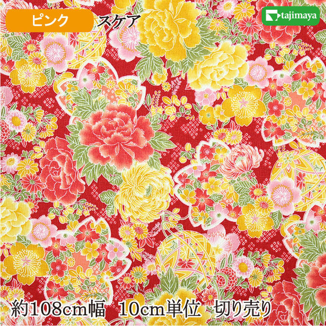 桜輪に鞠と牡丹菊文様 赤 約108cm幅 10cm単位 切り売り【布地 生地 和柄 マスク 和柄生地 コットン】
