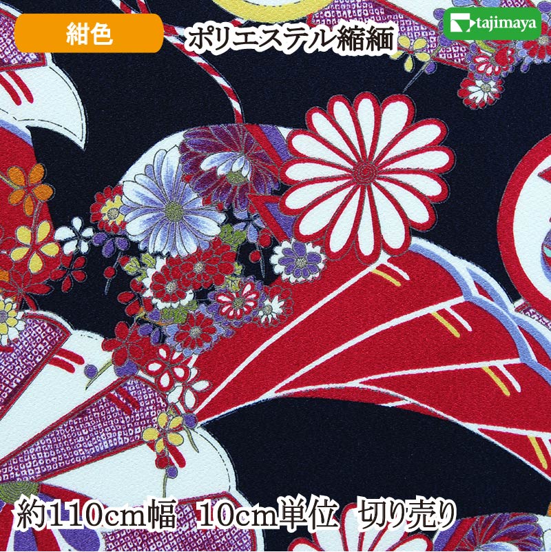和柄 ポリエステルちりめんプリント 嵯峨野の四季 紺 110cm幅 10cm単位 切り売り【布地 生地 和柄 和柄生地】