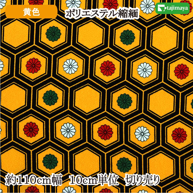 和柄 ポリエステルちりめんプリント 亀甲に菊 黄 110cm幅 10cm単位 切り売り【布地 生地 和柄 和柄生地】