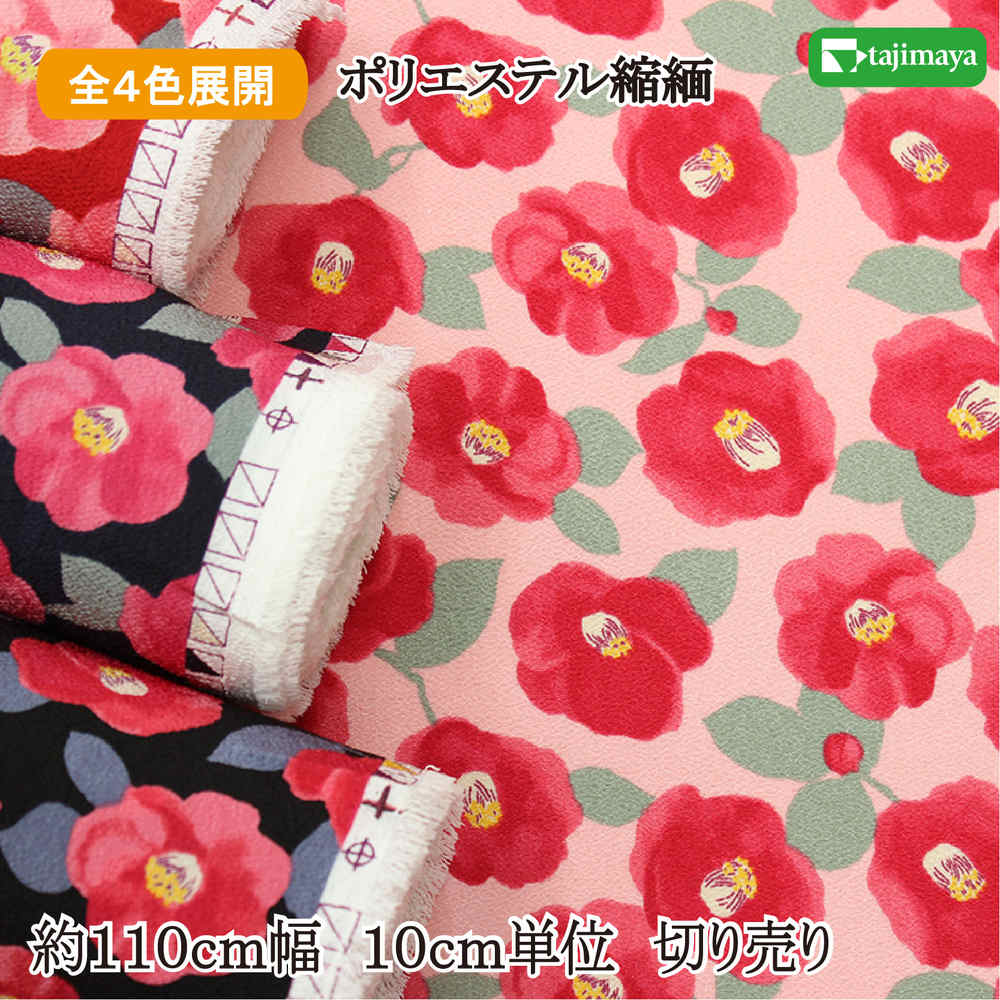 ポリエステルちりめんプリント つばき文様 全4色 約110cm幅 10cm単位 切り売り