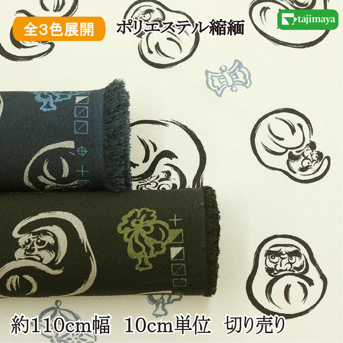 ポリエステルちりめんプリント だるま文様 全3色 約110cm幅 10cm単位 切り売り