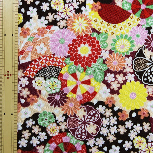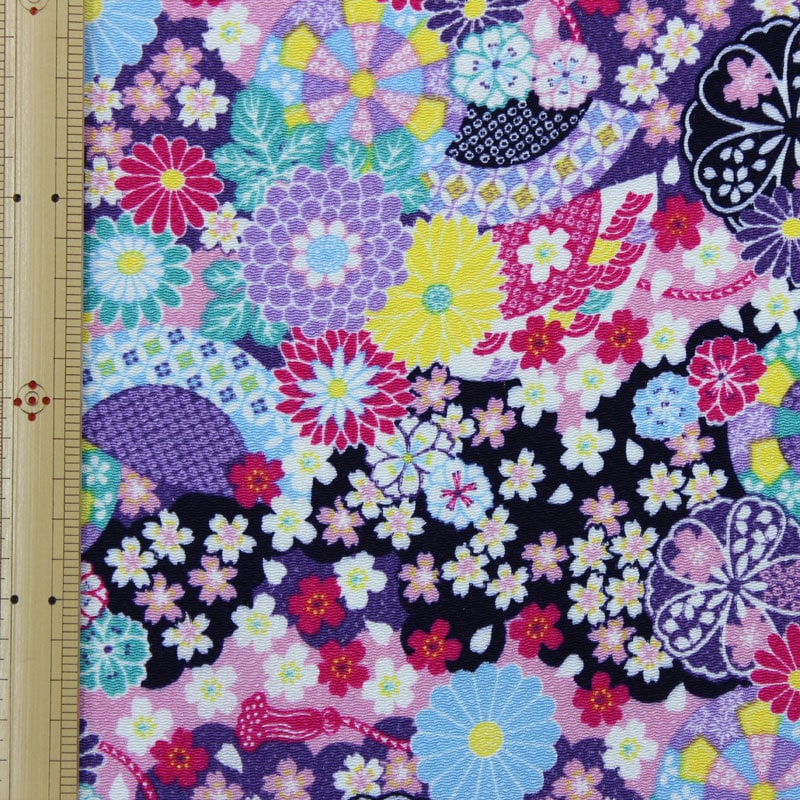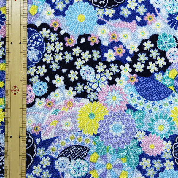レーヨンちりめん 蒔絵調 波に花散らし文様 65cm幅【布地 生地 和柄 縮緬】