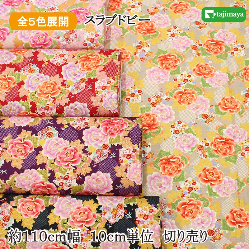 和柄 華麗な大輪牡丹と市松格子文様 全5色 約110cm幅 10cm単位 切り売り