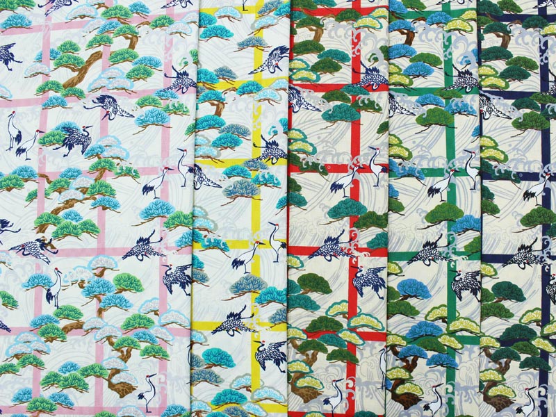 格子に波に鶴と松文様 全5色 110cm幅 10cm単位 切り売り【布地 生地 和柄】【和柄生地】