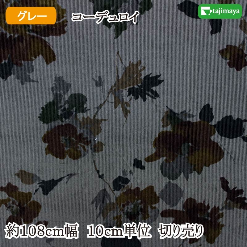 コーデュロイ(細コール) プリント生地 水彩花 グレー 約108cm幅 10cm単位 切り売り