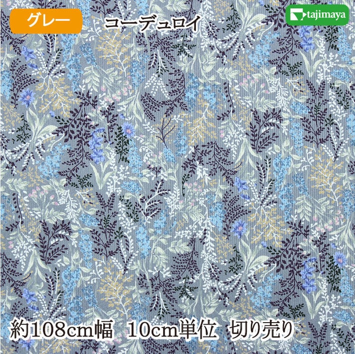 コーデュロイ(細コール) プリント生地 小花ボタニカル柄 グレー 約108cm幅 10cm単位 切り売り