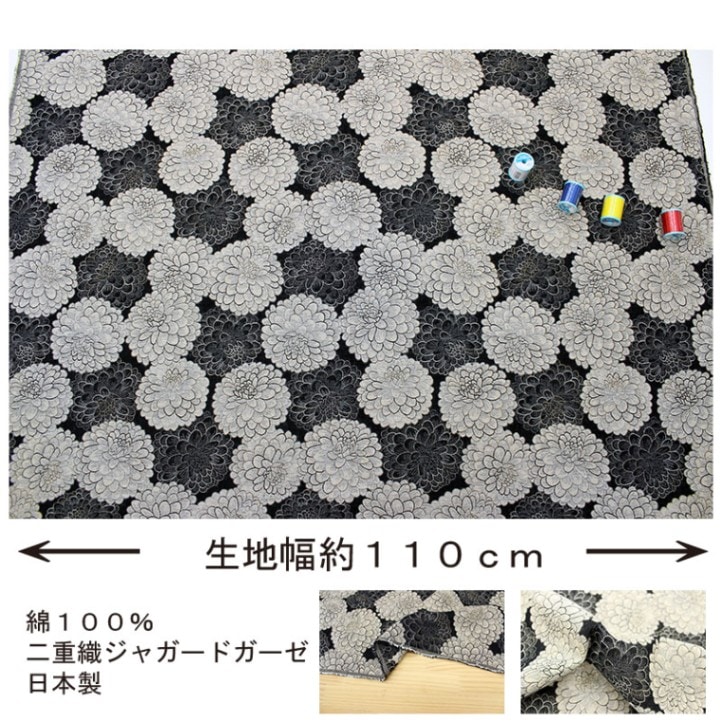 和柄 コットンこばやし 二重織ジャガードガーゼ 丸菊尽くし文様 黒 約110cm幅 10cm単位 切り売り 【布地 生地 和柄】